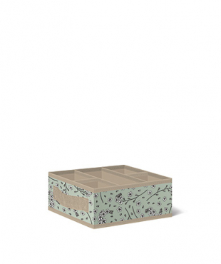 Коробка снаружи из ткани с принтом, внутри из однотонного спанбонда +кант. Съёмное дно с картоном + разделители на липучке- конструктор.