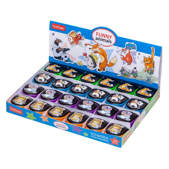 BS_10011 Точилка Hatber Пластиковая Цветная с контейнером -Funny animals- в картонной Дисплей-витрине