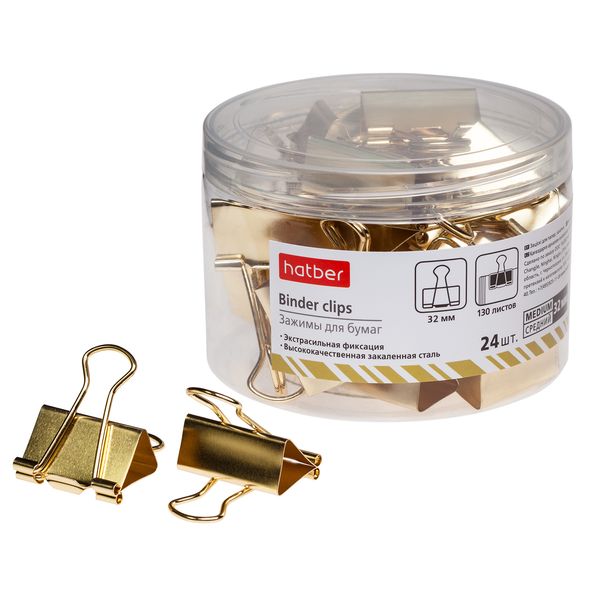 BC_059169 Зажимы для Бумаг Hatber 32мм Золотые 24шт. в пласт.тубе