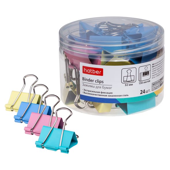BC_059117 Зажимы для Бумаг Hatber 32мм цветные 24шт. в пласт.тубе