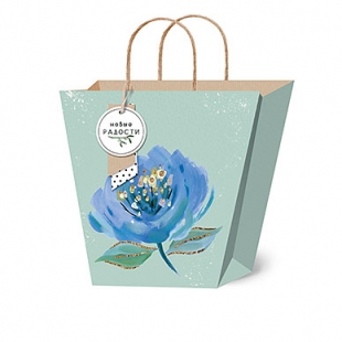 Матовая ламинация, выборочный УФ-лак, блёстки, деталь-бирка, ручки из крученного шпагата, атласная лента.