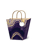 Матовая ламинация, выборочный УФ-лак, блёстки в лаке, детали-бирки, ручки из крученого шпагата, атласная лента.