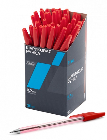 7CB_00043 РУЧКА Hatber шариковая T-34 Красная 0,7мм с колпачком и клипом на масл.основе 50шт в Диспл