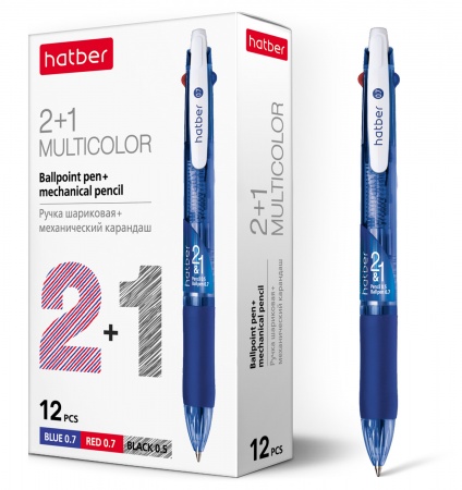 BP_058658 РУЧКА Hatber шариковая 2+1 (синий,красный+карандаш) 0,7мм чернила на масл.основе игольч.пишущ.узел с резиновым грипом 12шт. в картонной коробке