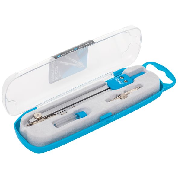 Металлические части чертежного инструмента ТМ Hatber изготовлены из цинка, надежный соединительный механизм позволяет выдерживать многократные циклические нагрузки. Готовальня упакована в пластиковый пенал с прозрачной крышкой, оснащена европодвесом для расположения на специальных стойках с навесными крючками. Предназначена для учеников старших классов и студентов. Наполнение из пяти предметов: циркуль, точечная насадка, рейсфедерная вставка, держатель для нее и пенал с запасным грифелем.