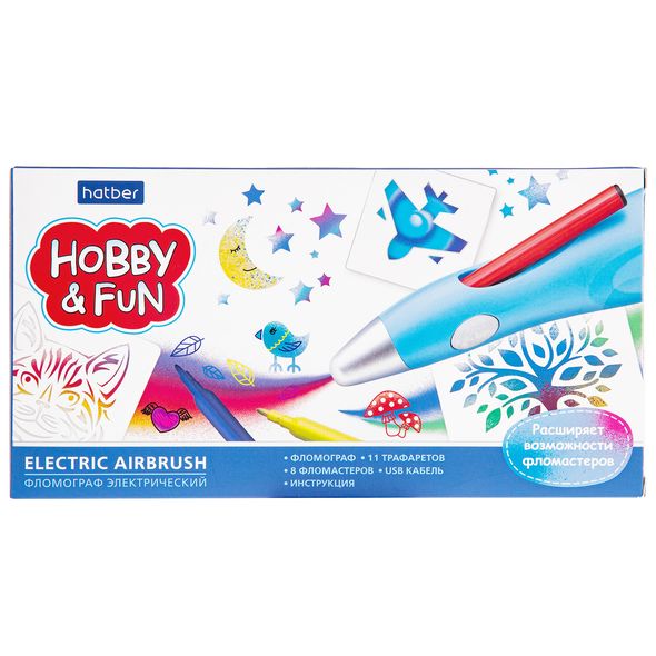 Фломограф Hatber - это новая, удивительная техника рисования! Обычные фломастеры он превращает в инструмент для красочной аэрографии. Ваш ребенок сможет создавать картины с потрясающими визуальными эффектами, недоступными обычным фломастерам. И не только на бумаге, но и на дереве, пластике и стекле! Для тех, кто пока еще не очень хорошо умеет рисовать, мы добавили в набор удобные трафареты. Даже малыши смогут делать картинки с их помощью. Фломограф питается от встроенной батареи, заряда хватает на несколько часов рисования. В комплекте 8 фломастеров; можно использовать фломастеры Hatber серии Colora, а также других серий со специальной маркировкой (см. картинку). В набор входит: фломограф, 11 трафаретов, 8 фломастеров, USB кабель, инструкция.