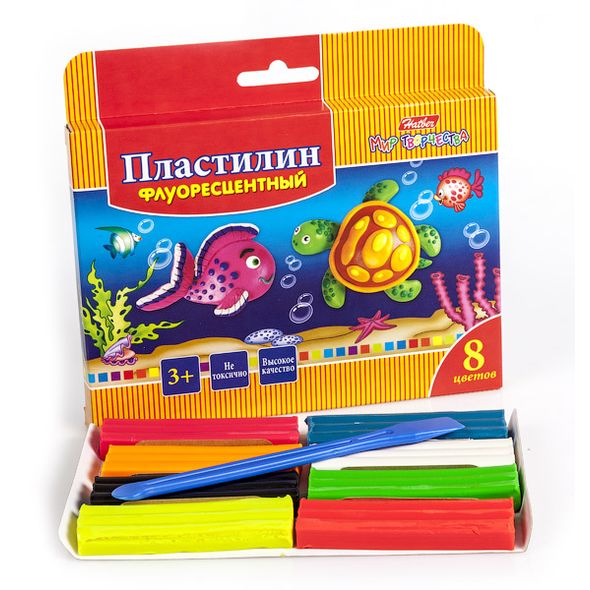 KPf_08210 Пластилин Восковой флуоресцентный 8 цв.120г Hatber со стеком- Морская семейка- с европ